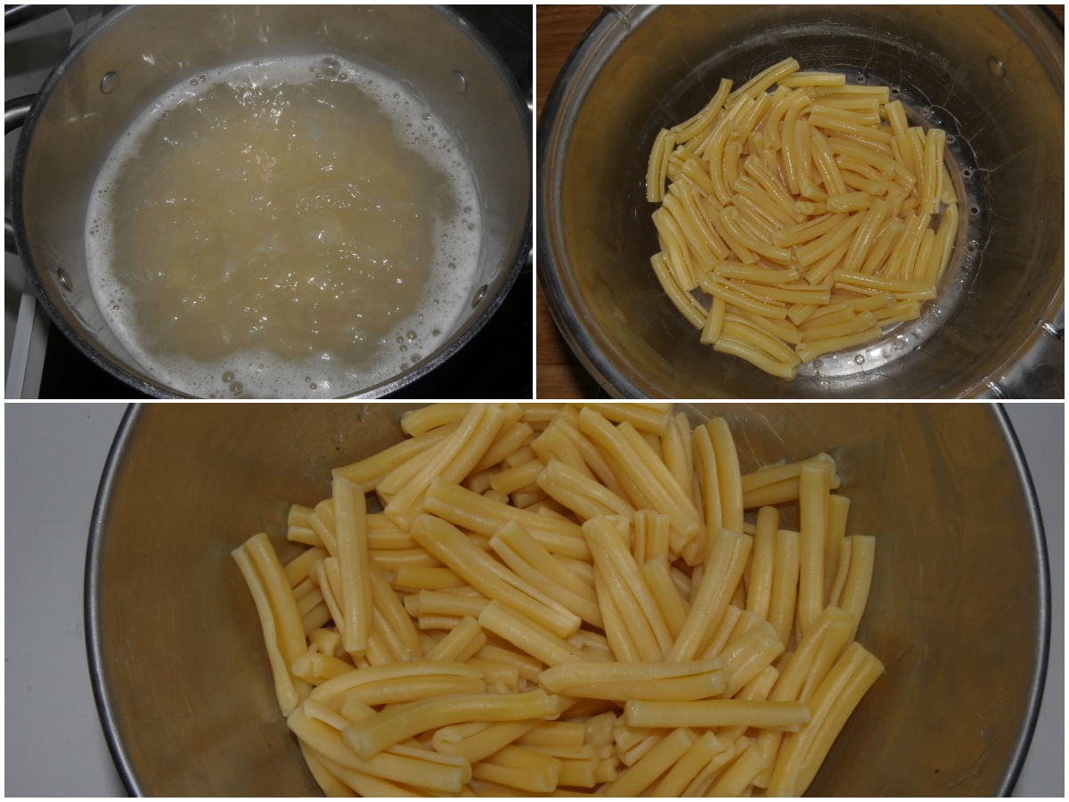Innanzitutto mettete a cuocere la pasta in abbondante acqua già bollente e leggermente salata, scolandola poi al dente.