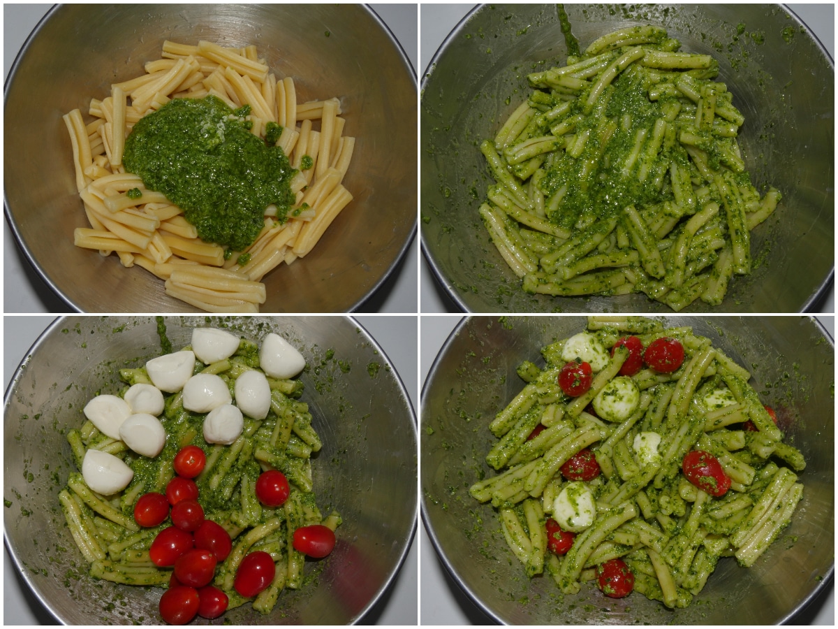 Unite tutti gli ingredienti in una ciotola: pasta, pesto, pomodorini lavati, mozzarella ben sgocciolata, e amalgamate delicatamente, aggiustate di sale se serve.