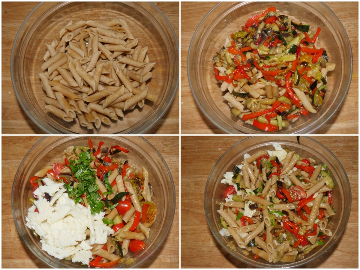 Assemblate: unite in una ciotola la pasta, le verdure cotte, i pomodorini, il formaggio a tocchetti, tanto basilico e un pochino di olio e sale se serve, e mescolate.