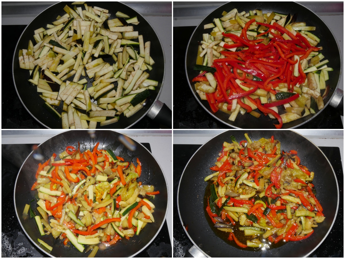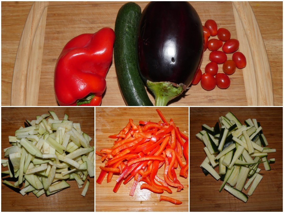 Mondate le verdure, lavatele e tagliatele (peperone, melanzana e zucchina a listarelle, i pomodorini a metà o in 4 parti, a seconda delle dimensioni).