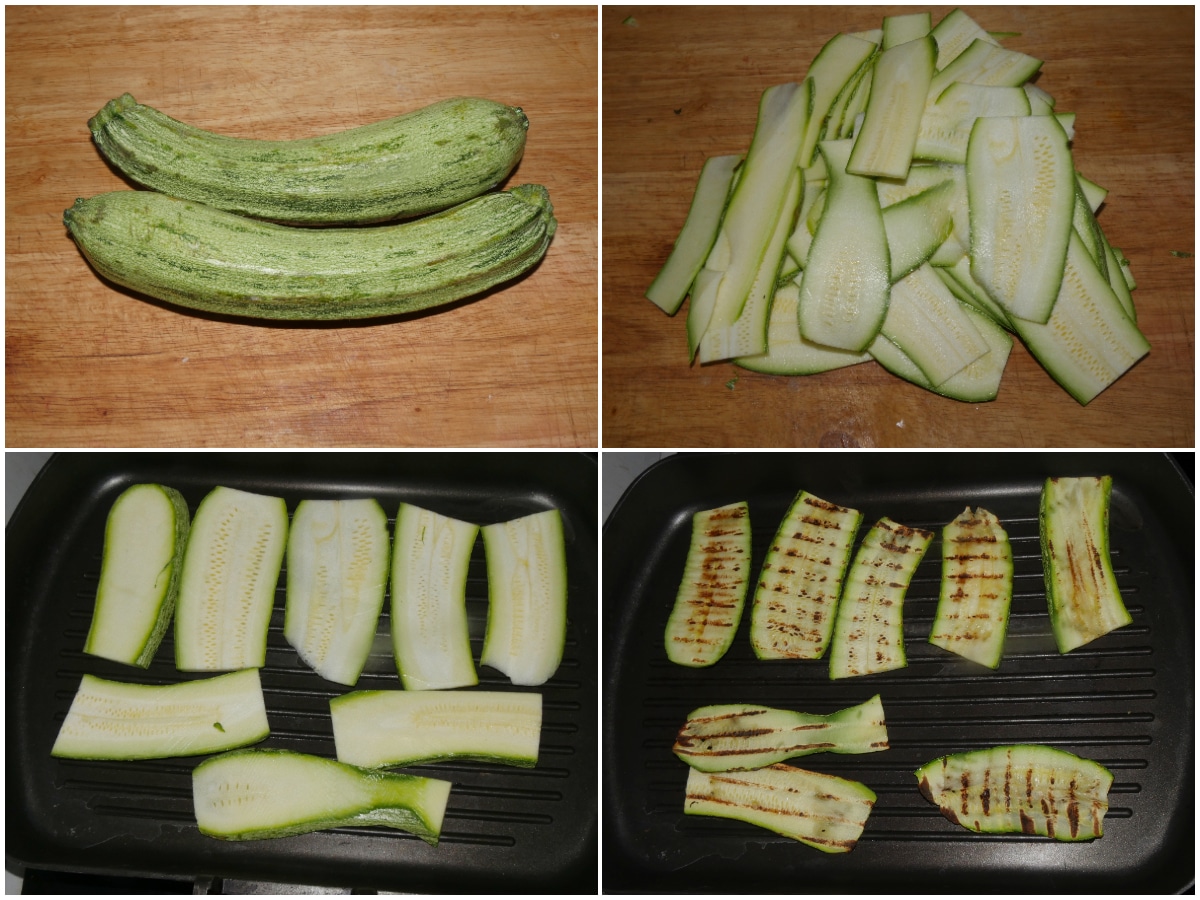 Lavate e spuntate le zucchine e tagliate nel senso della lunghezza delle fette dello spessore di circa un centimetro. Grigliate le zucchine sulla piastra.