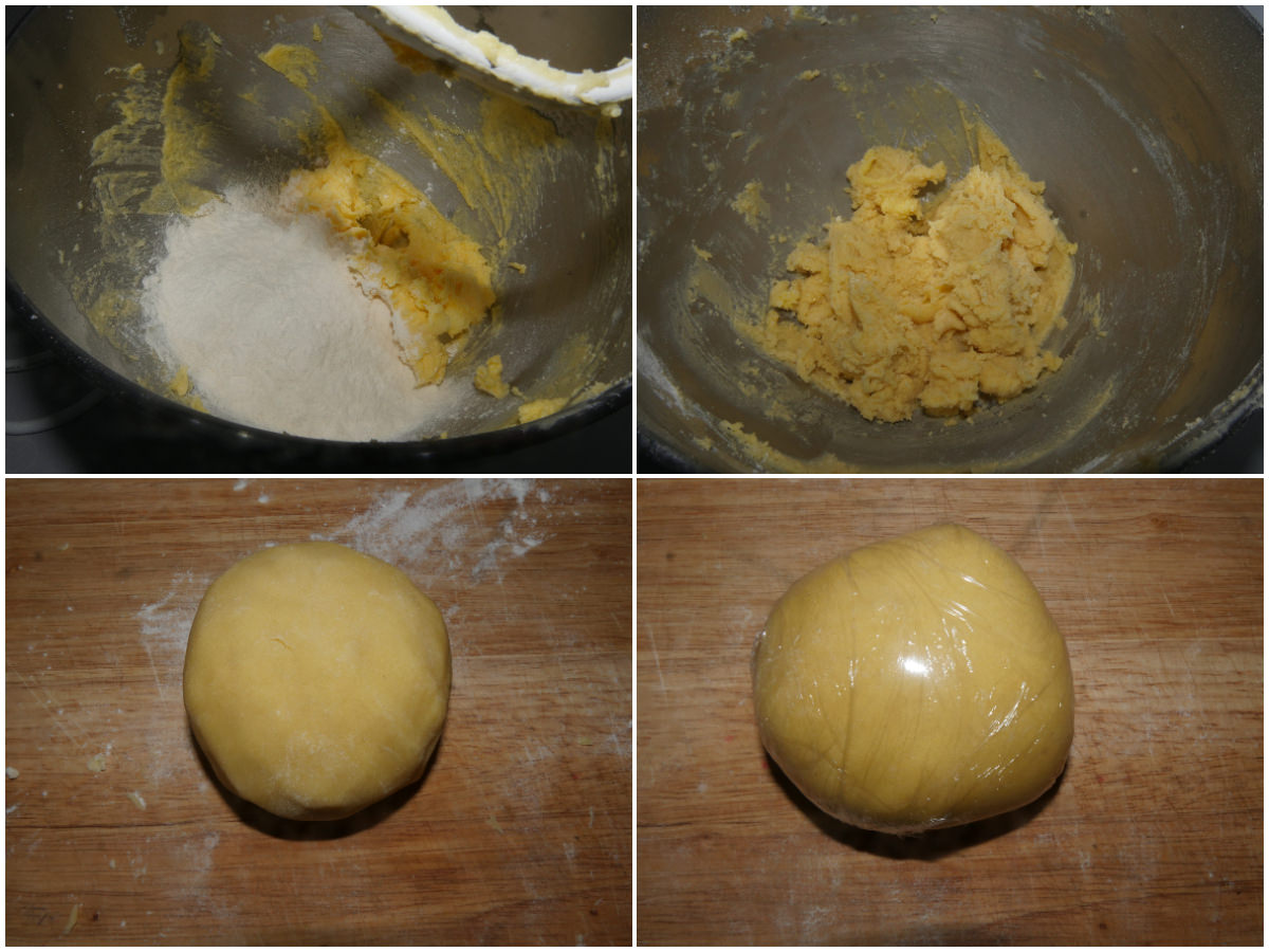 Aggiungete farina e lievito e impastate fino ad ottenere un composto omogeneo, quindi avvolgete con pellicola trasparente e lasciate riposare in frigo per almeno 1 ora.