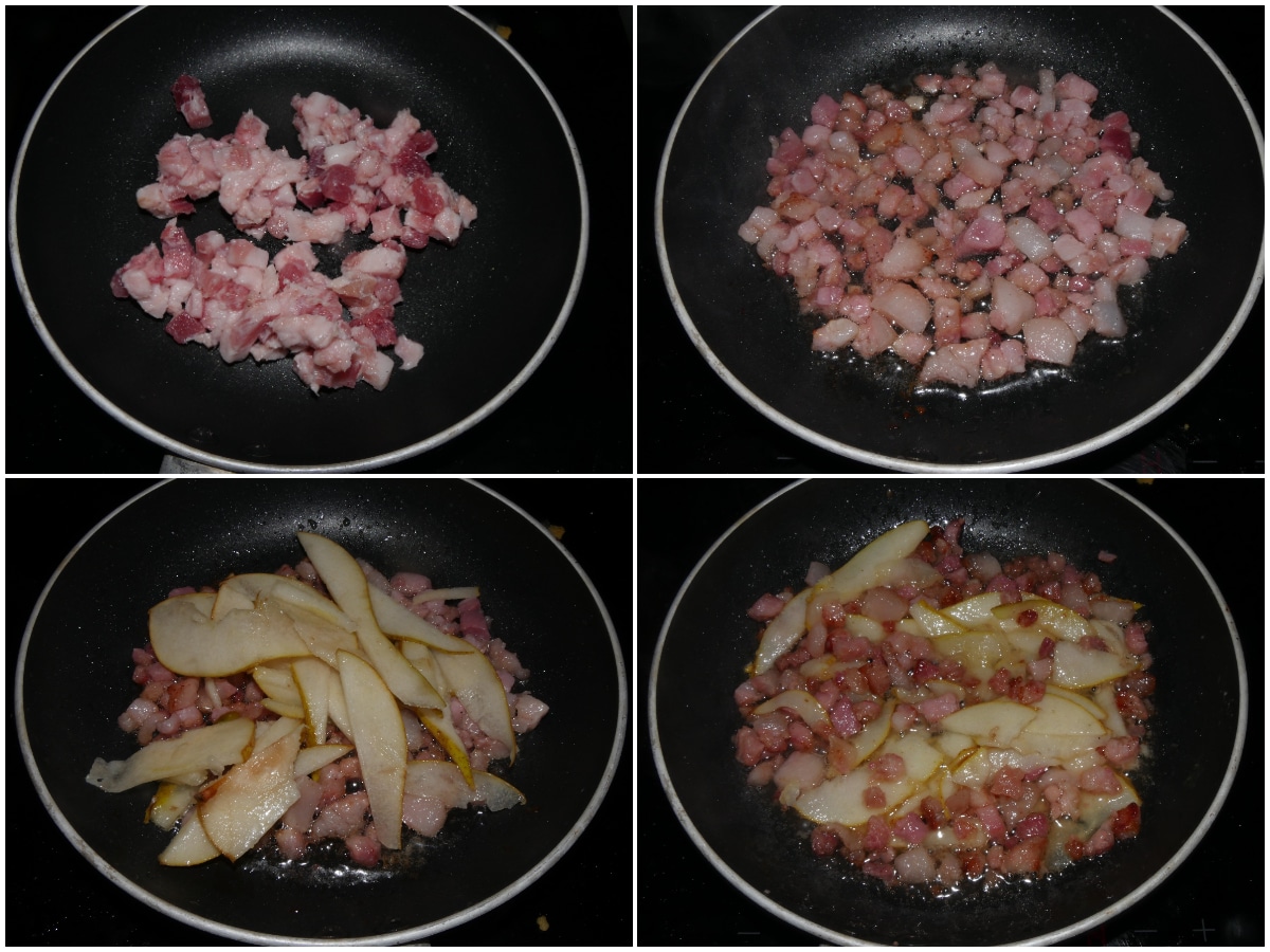 Fate dorare per bene il guanciale in una padella antiaderente, quindi unite le pere e lasciatele insaporire, quindi metteteli da parte.