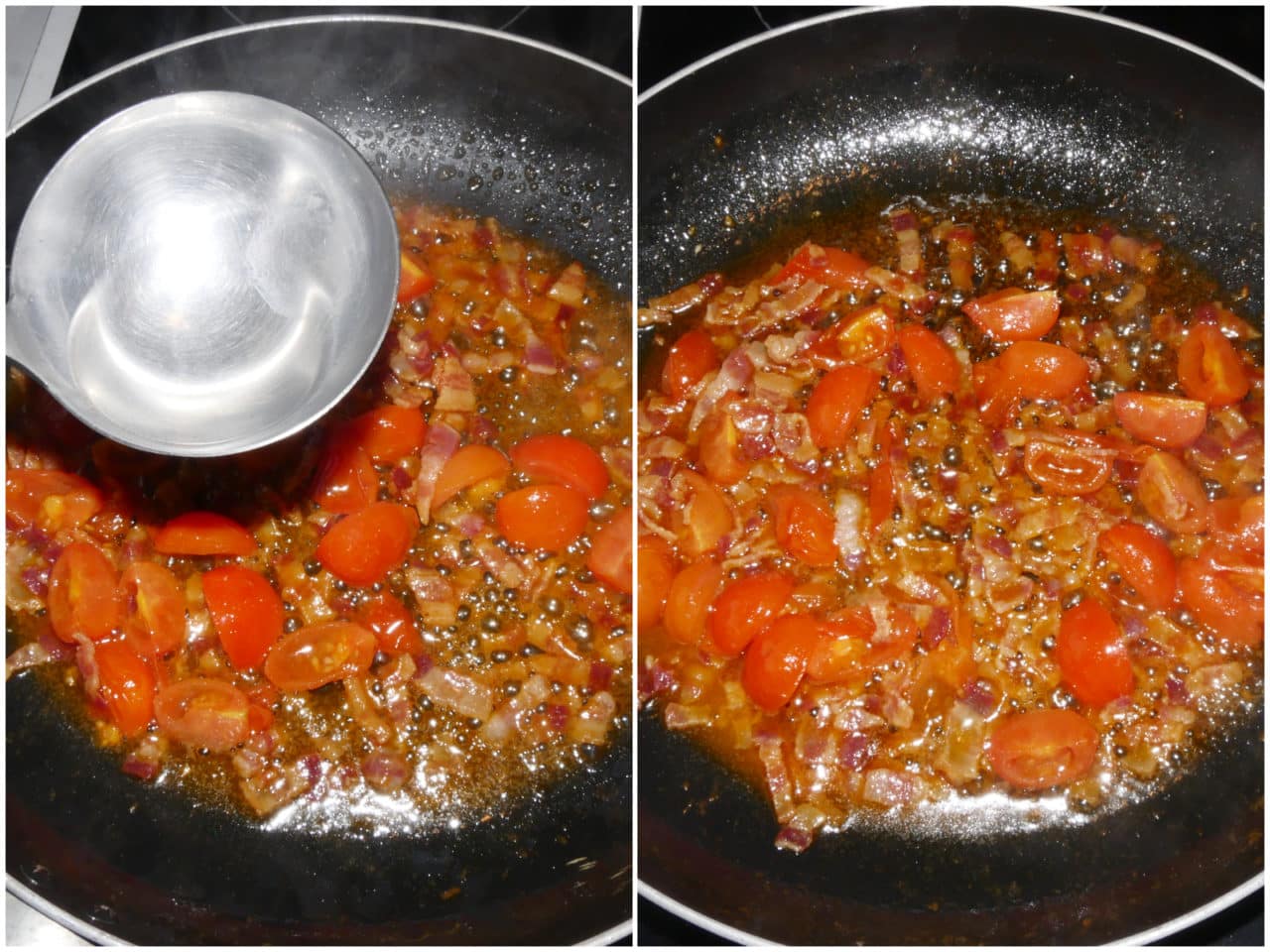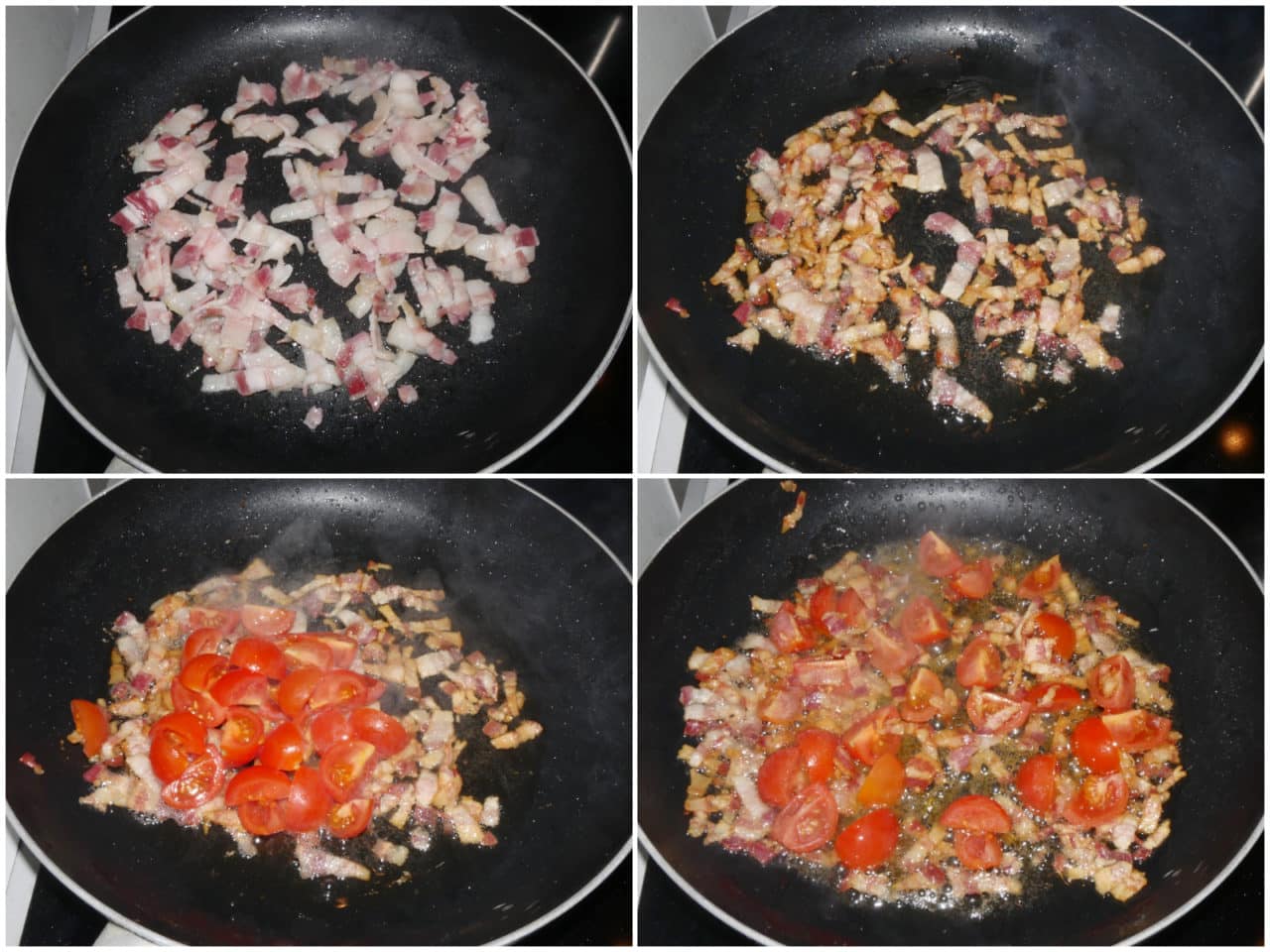 Quando la pancetta sarà ben dorata aggiungete anche i pomodorini,