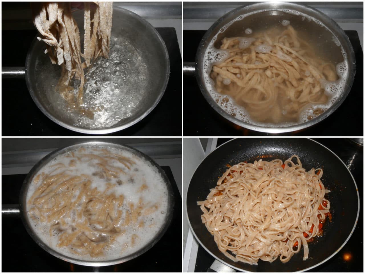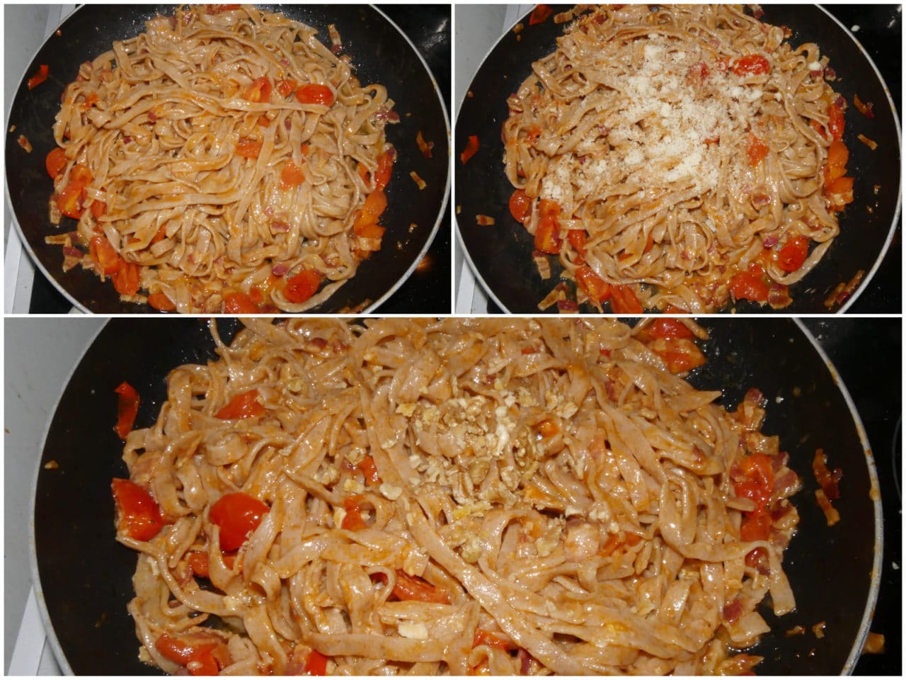 Cuocete la pasta, scolatela al dente e aggiungetela direttamente nella padella con il condimento, matentecando con il formaggio e aggiungendo le noci (tritate grossolanamente) solo alla fine.