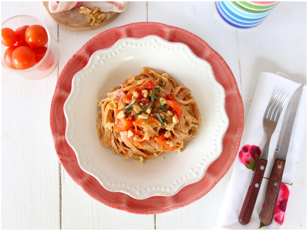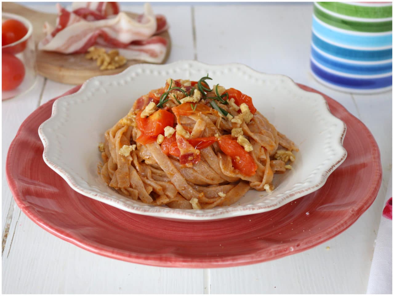La pasta integrale con pomodorini e pancetta è il piatto delizioso di cui vi ho parlato, la ricetta che ho pensato per sfruttare le mie tagliatelle integrali fatte in casa. Naturalmente potete usare delle qualsiasi tagliatelle o altri tipi di pasta, anche se questo condimento secondo me si sposa davvero bene con la pasta integrale. Per i più golosi, suggerisco di aggiungere un pochino di rosmarino fresco a fine cottura, dà un tocco di colore, ma rende anche aroma e gusto ancora più gustosi ;)