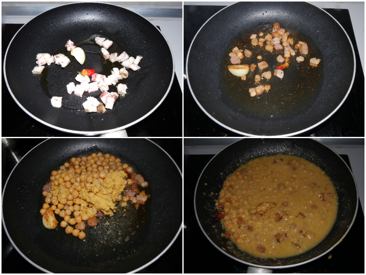 Fate dorare aglio, lardo e peperoncino con poco olio, lasciando rosolare per bene il lardo, quindi unite i ceci (sia quelli interi che quelli schiacciati), eliminate l'aglio e aggiungete un pochino di brodo caldo per renderli cremosi.