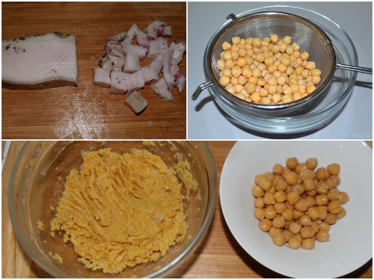 Tagliate il lardo a cubetti; scolate i ceci, sciacquateli bene, quindi sciacciatene 2/3 con una forchetta, conservando il resto interi.