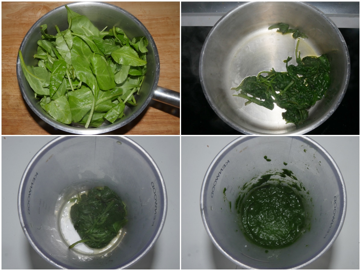 Mondate gli spinaci, lavateli, metteteli in una pentola, coprite con coperchio e cuocete per pochi minuti, finché non saranno appassiti, quindi strizzateli, frullateli e lasciateli raffreddare.