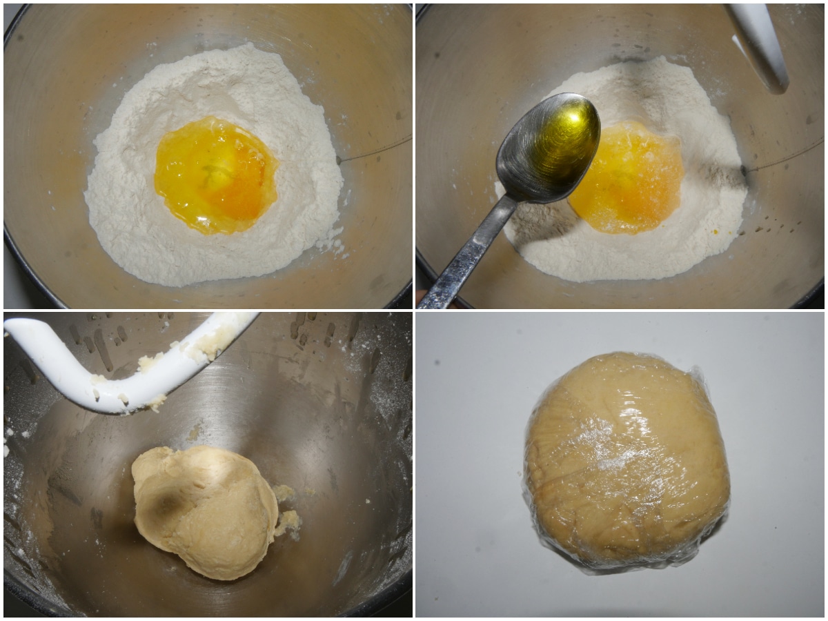 Preparate l'impasto bianco unendo in una ciotola farina, uova e olio e lavorando velocemente fino ad ottenere un panetto omogeneo, quindi copritelo con pellicola per alimenti e lasciate riposare per almeno 30 minuti a temperatura ambiente.