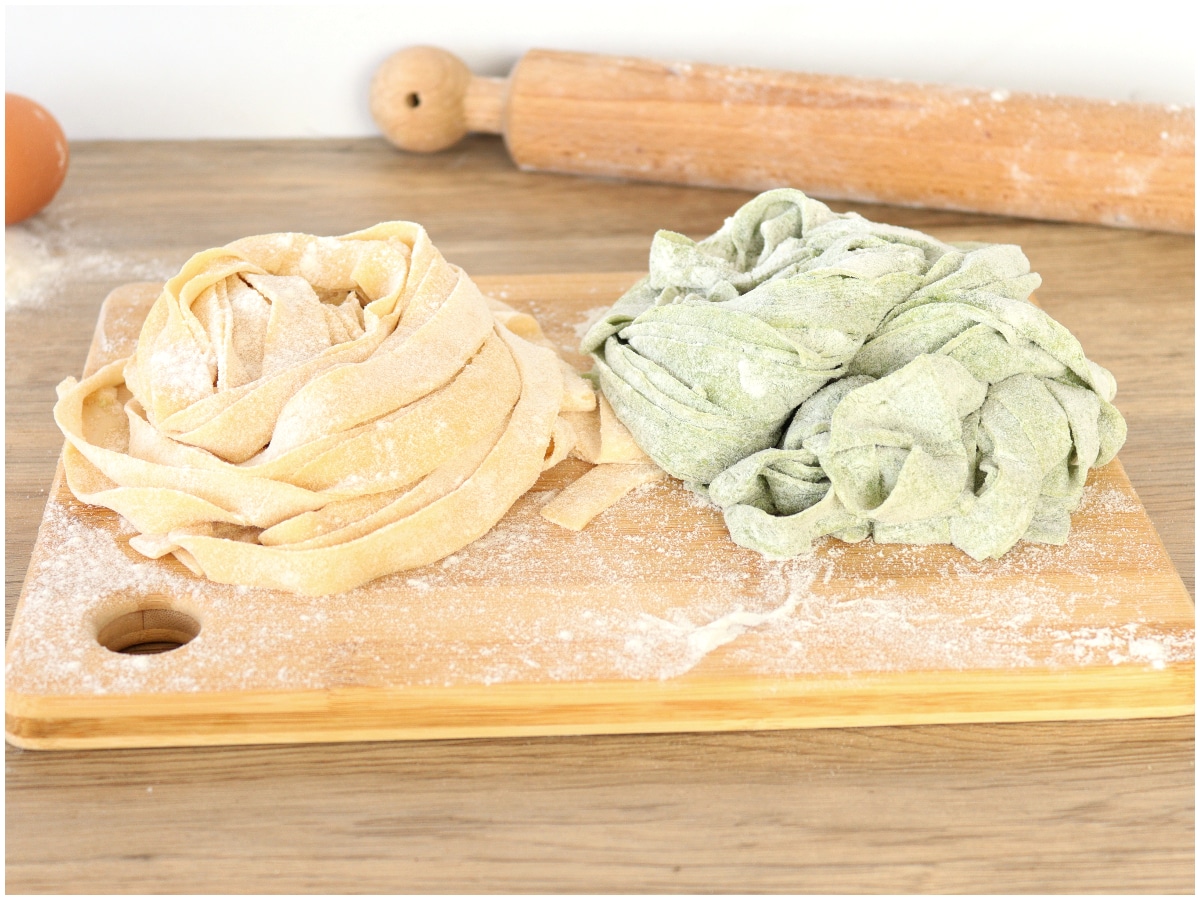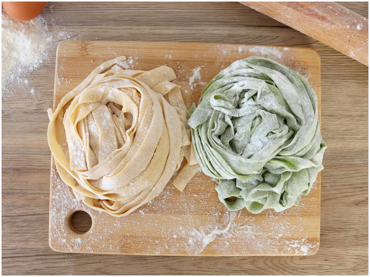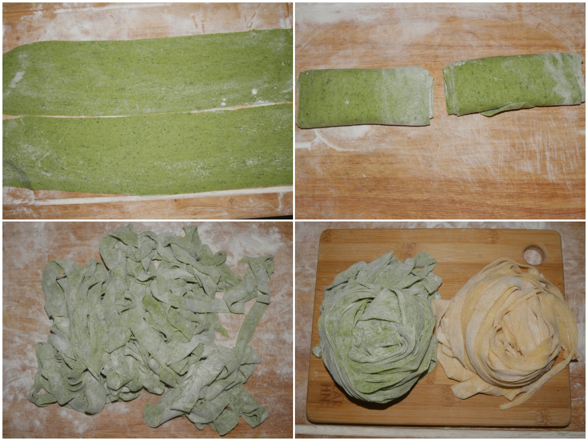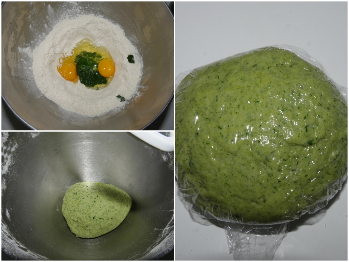 Intanto preparate la pasta verde: unite tutti gli ingredienti (farina, uova, spinaci e olio) in una ciotola e lavorate anche questa, quindi coprite con pellicola e lasciate riposare insieme all'altra.