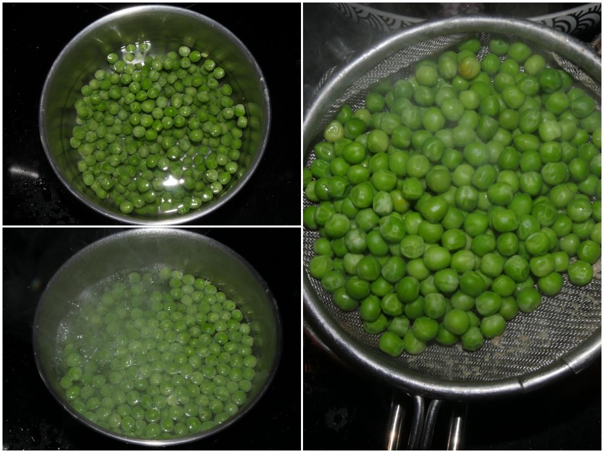 Lessate i piselli in acqua bollente per pochi minuti (5 dovrebbero bastare), quindi scolateli.