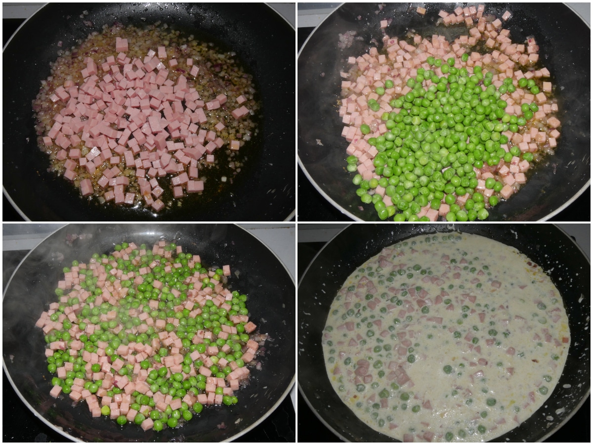 Mentre la pasta riposa potete preparare il condimento: io ho optato per il condimento classico, ovvero panna, prosciutto e piselli, forse fuori moda, ma a mio avviso sempre buonissimo!