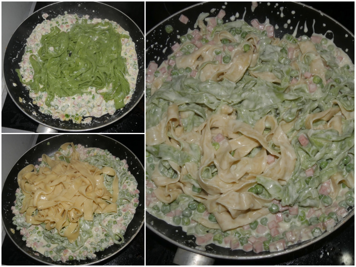 Ed ecco qui la mia pasta paglia e fieno condita con panna, prosciutto e piselli.