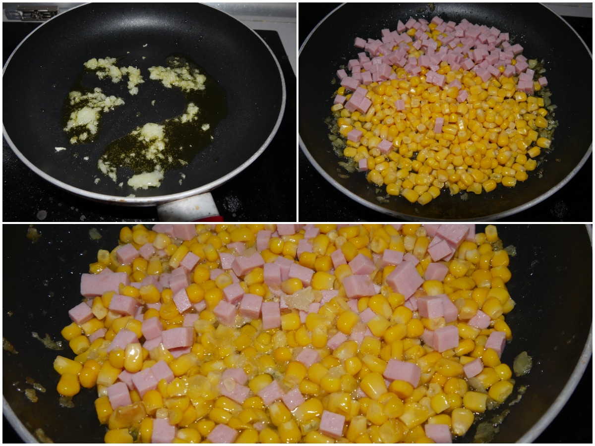Tritate finemente il cipollotto e fatelo appassire con un po' di olio in un'ampia padella antiaderente, quindi aggiungete anche il mais (ben scolato e sciacquato) e il prosciutto e lasciate insaporire per qualche minuto, quindi lasciate cuocere per 10-15 minuti.