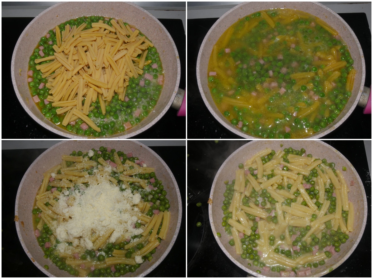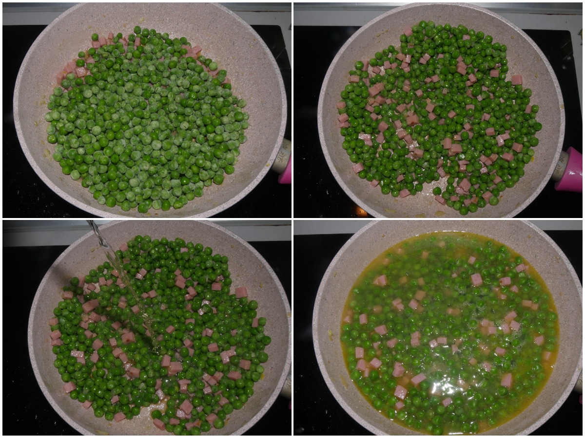 Unite anche i piselli: io ho usato quelli surgelati, li ho aggiunti al prosciutto e, una volta scongelati ho aggiunto acqua calda fino a coprire bene il tutto.