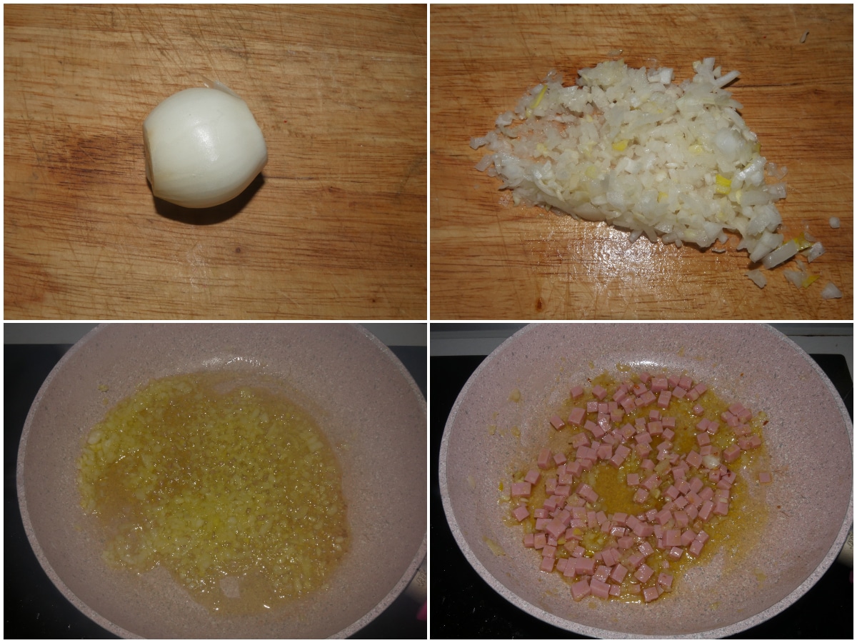 Innanzitutto tritate finemente la cipolla e tagliate il prosciutto a dadini, quindi fate appassire la prima in una casseruola ampia con dell'olio, e poi aggiungete anche il secondo, lasciandolo insaporire velocemente.