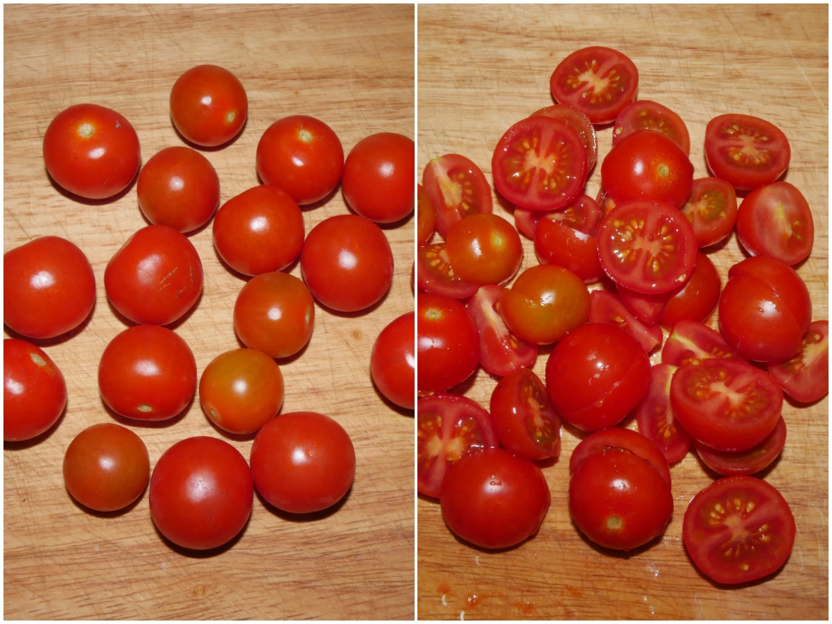 Innanzitutto lavate i pomodorini e tagliateli a metà (o in 4, se sono grandi).