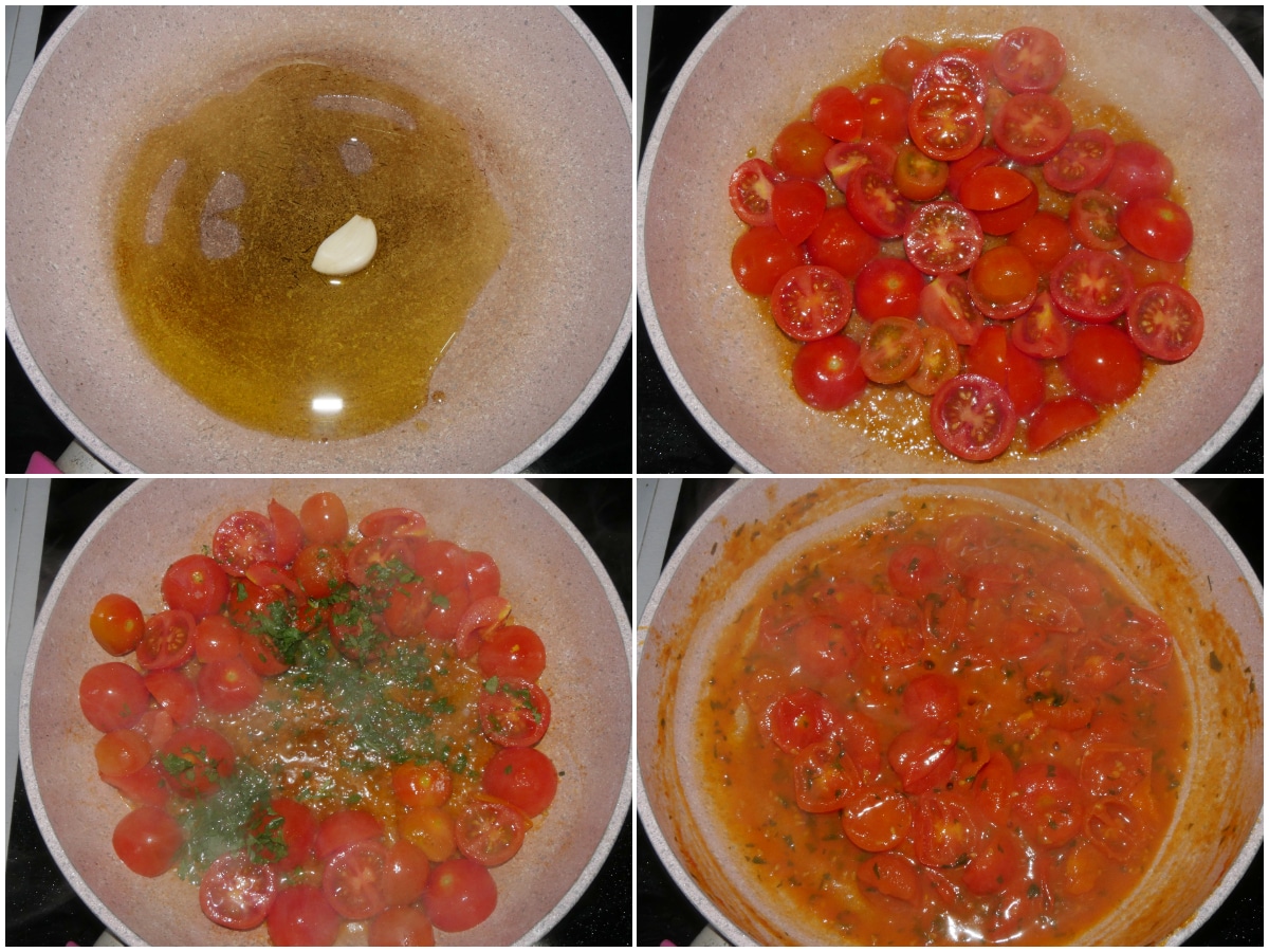 Preparate un sughetto con aglio, olio, pomodorini, origano (o basilico) e sale e pepe a piacere in un'ampia padella antiaderente.
