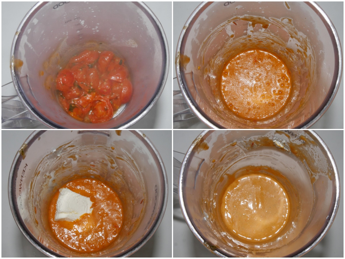 Eliminate l'aglio e frullate metà dei pomodorini con la robiola fino ad ottenere una crema liscia.