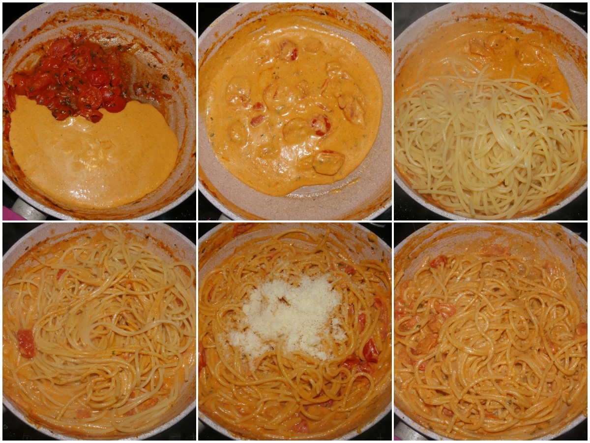 Unite la crema di pomodori e formaggio ai pomodorini nella padella; quando la pasta sarà al dente scolatela, aggiungetela al condimento e mantecate con il grana.