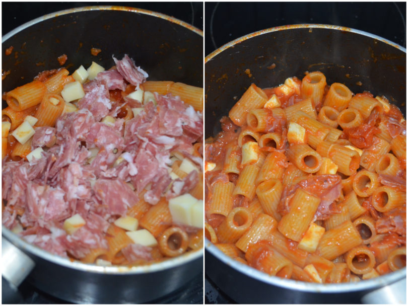 Tagliare salame e scamorza a pezzetti e aggiungeteli alla pasta.