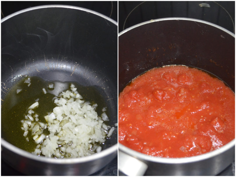Tritate la cipolla e fatela appassire con l'olio in una pentola, quindi unite la polpa di pomodoro e un po' di basilico spezzettasto, salate e cuocete per almeno 15 minuti.