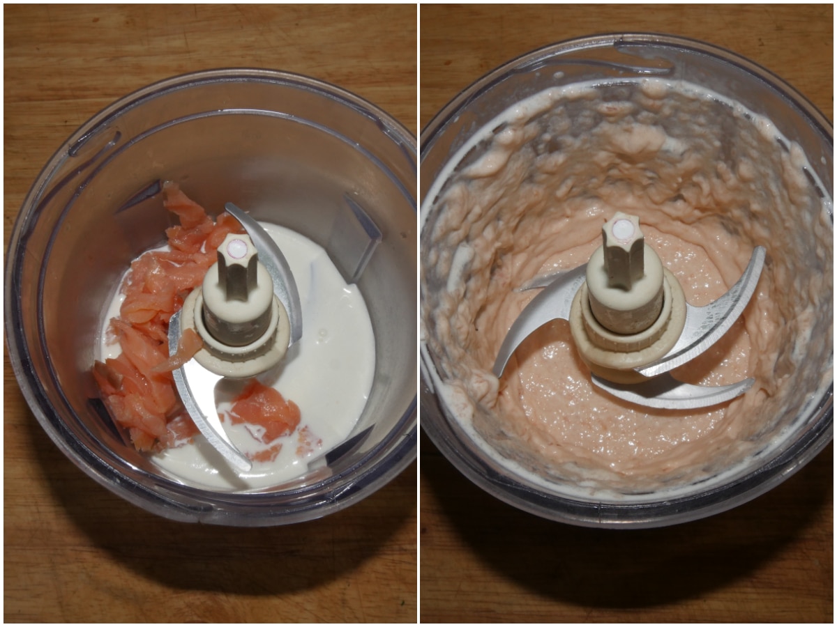 Preparate la crema: mettete metà del salmone e tutta la panna in un mixer e frullate fino ad ottenere una crema liscia.
