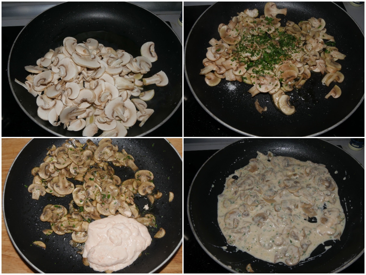 Nel frattempo che l'acqua bolle cuocete i funghi: fate dorare la cipolla tritata con l'olio in un'ampia padella antiaderente, quindi aggiungete i funghi e lasciateli insaporire, poi aggiungete il prezzemolo tritato e la crema di salmone e aggiustate di sale e pepe.