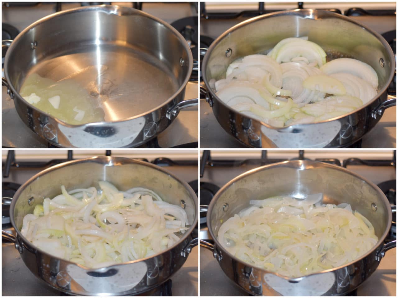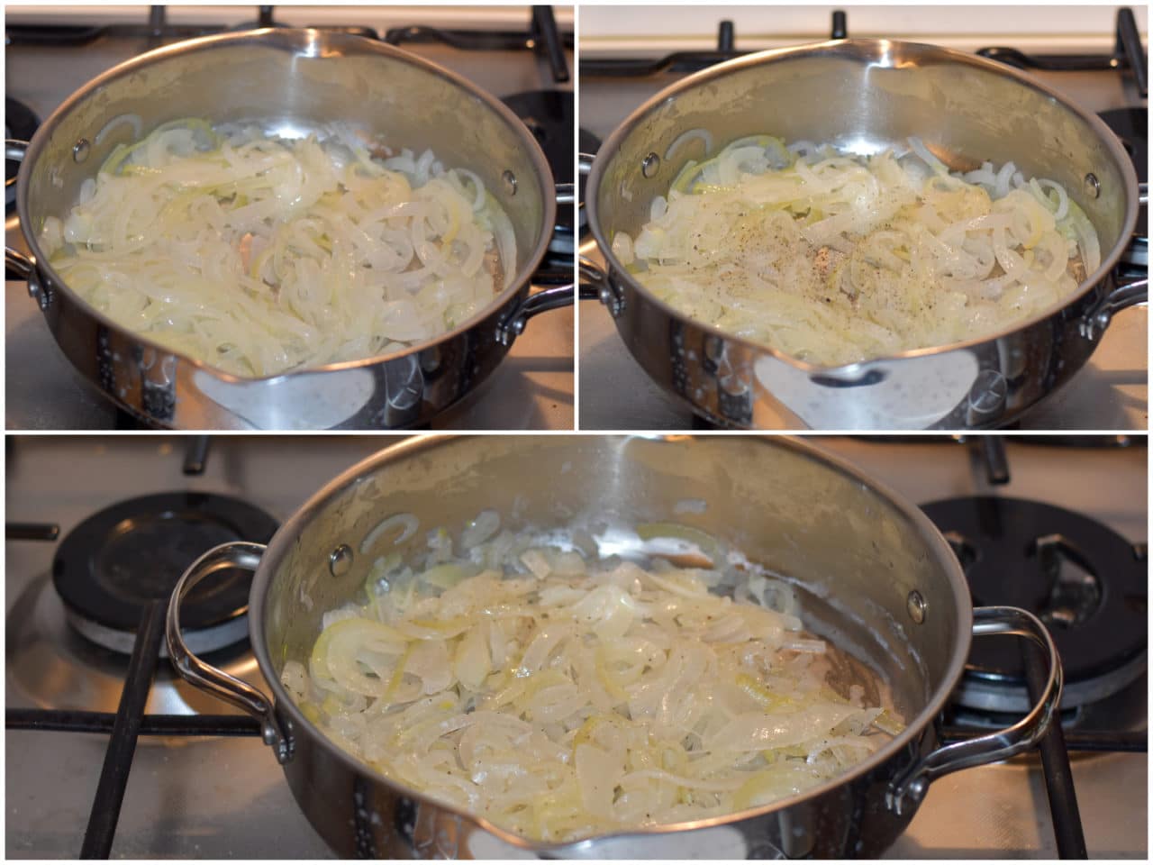 Fate sciogliere il burro in una casseruola, unite le cipolle e lasciatele appassire dolcemente, unendo poca acqua se serve, per circa 15-20 minuti o finché non risulteranno morbide, condendole con sale e pepe verso fine cottura.