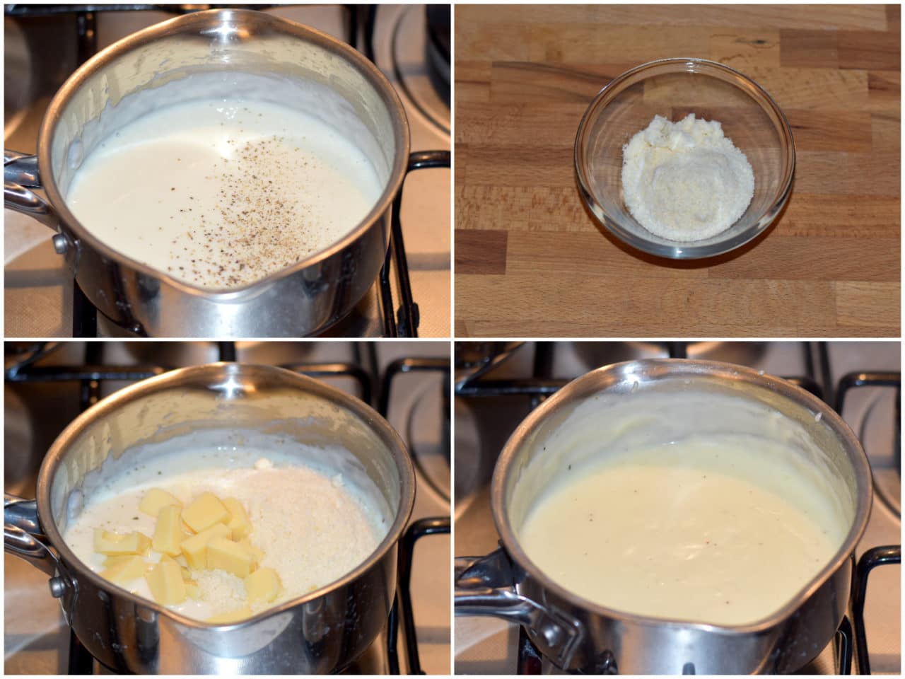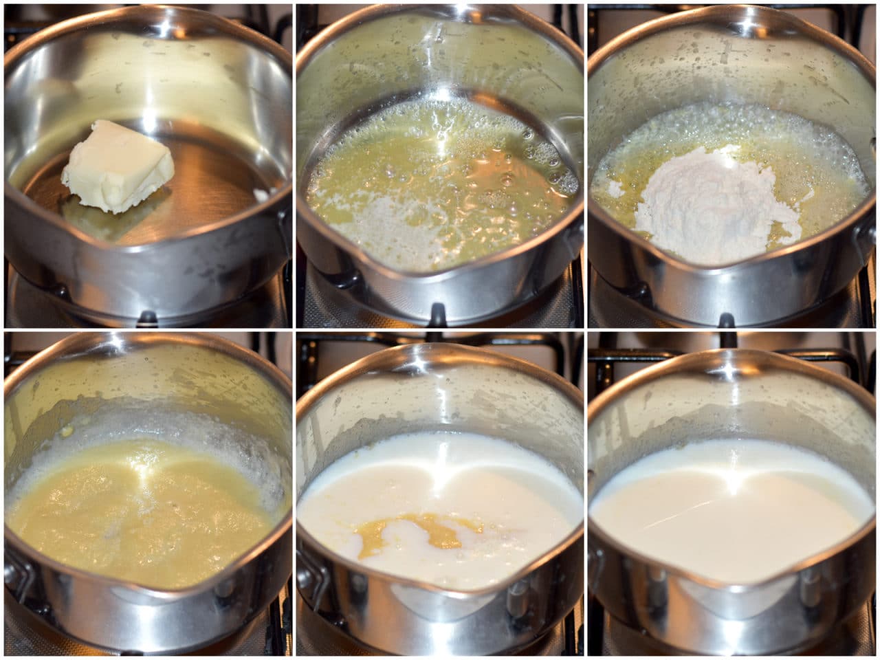 Intanto che le cipolle cuociono preparate la besciamella: fate sciogliere il burro in un pentolino, poi unite la farina e mescolate bene, infine incorporate il latte, sbattendo bene con una frusta e continuando la cottura a fiamma bassa, mescolando costantemente, fino ad ottenere una salsa densa.