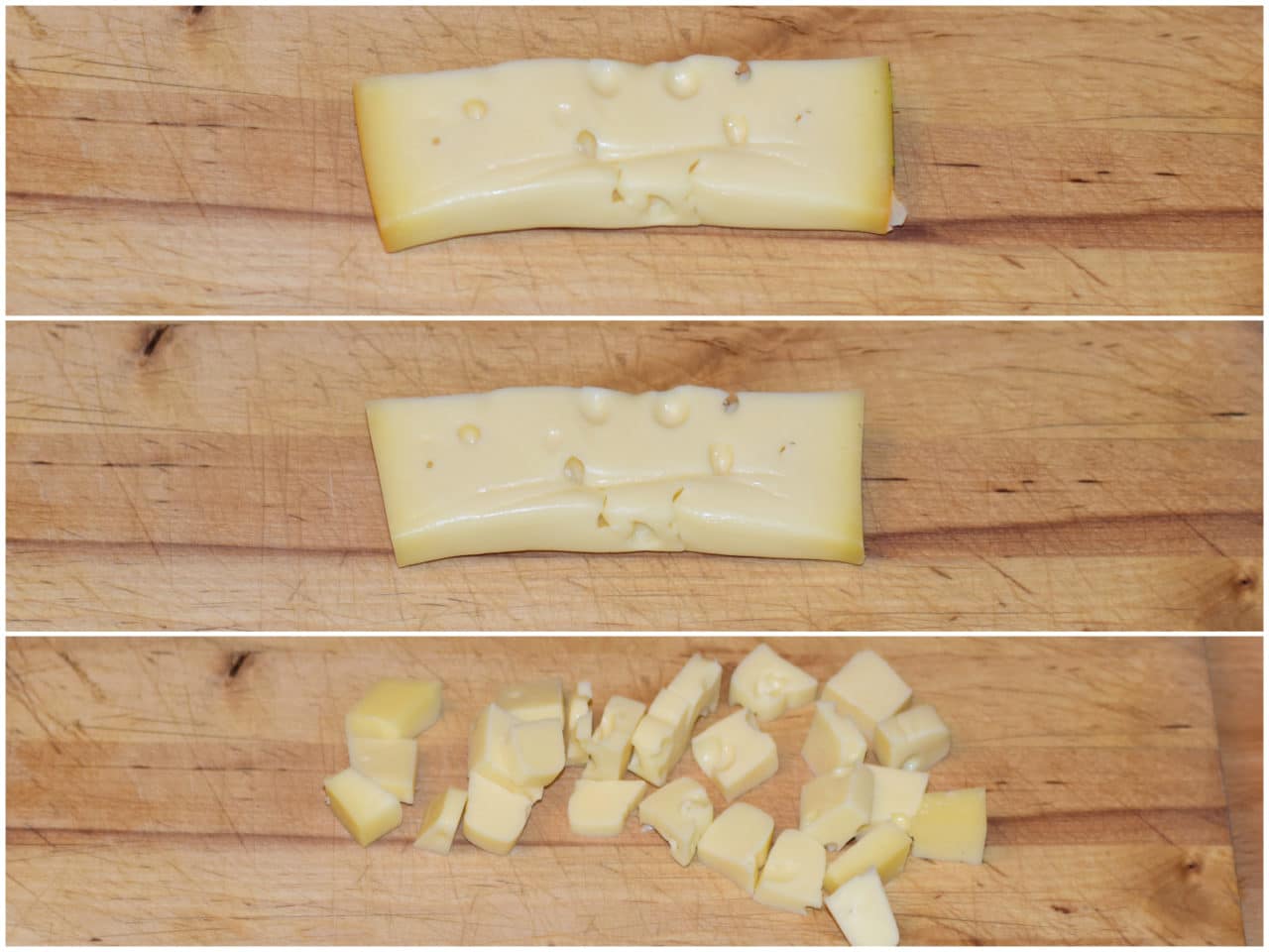 Tagliate l'emmental a cubetti e grattugiate il grana.