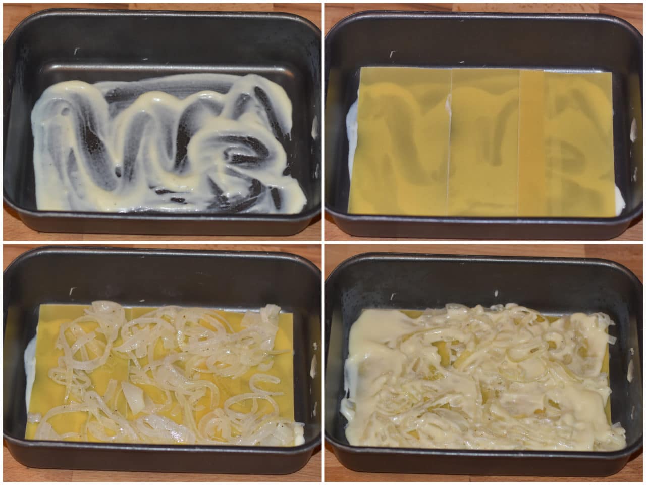 Assemblate il pasticcio: mettete poca besciamella sul fondo della teglia, create uno strato di pasta e copritelo con cipolle e altra besciamella.