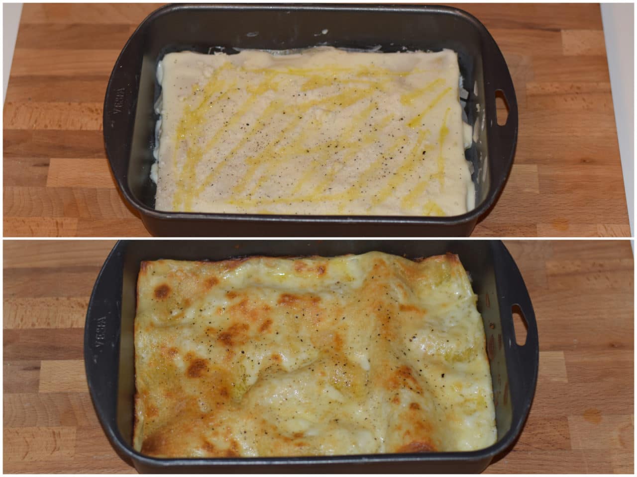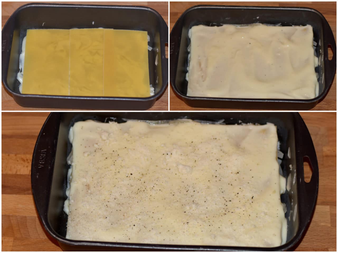 Continuate ad alternare gli strati, concludendo con pasta e besciamella, poi spolverate con il grana rimasto e un po' di pepe.