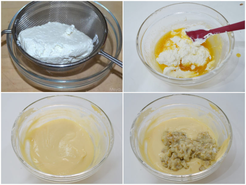 Setacciate la ricotta e mescolatela con millefiori, fior d'arancio e lo zabaione ormai freddo.