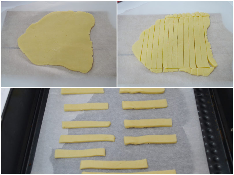 Stendete la pasta frolla e ritagliate delle striscette da 5x0.5 cm (o a seconda del bicchiere che avete scelto di usare).