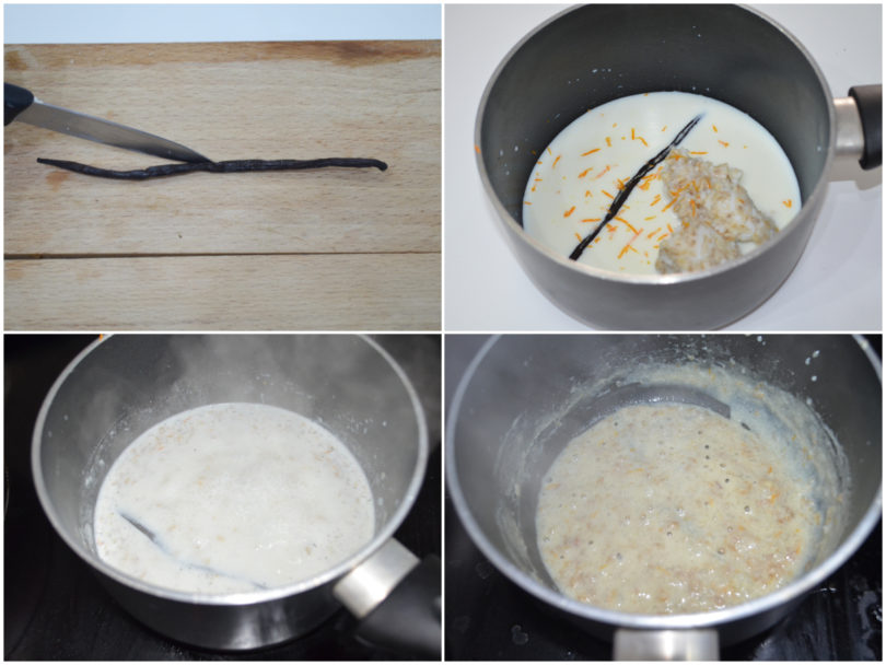 Versate latte, grano, lo zucchero rimanente, cannella, buccia di arancia grattugiata e bacca di vaniglia incisa in un pentolino.