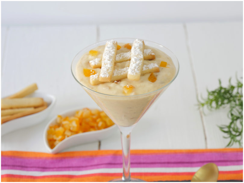 Riempite i bicchieri da martini di crema, quindi decorate con 4 bacchette di frolla incrociate, zucchero a velo e canditi e servite la vostra pastiera al bicchiere!