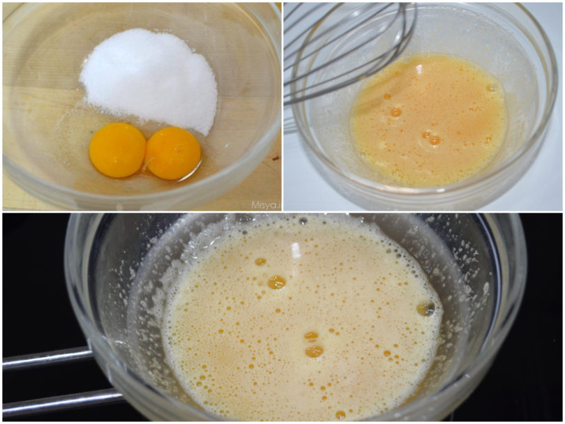 Sbattete bene le uova con metà dello zucchero, quindi cuocete a bagnomaria, sempre continuando a montare con le fruste, per circa 10 minuti o fino a portarlo a 72°C.