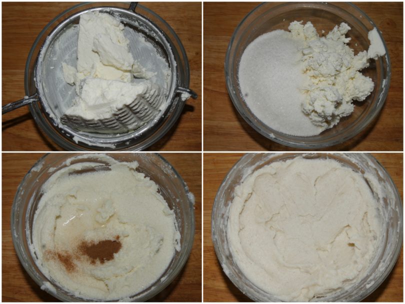 Passare la ricotta al setaccio, raccoglierla in una terrina e lavorarla con lo zucchero fino ad ottenere una crema liscia ed omogenea. Aggiungete cannella e fiori d'arancio