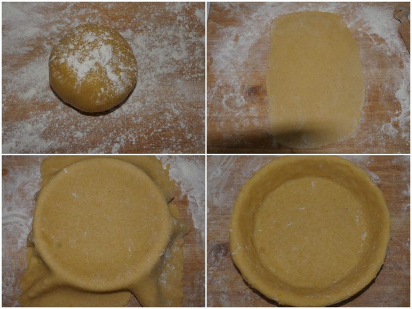 Su una spianatoia infarinata, stendere uno strato di pasta frolla di uno spessore di 3 mm.Foderare con la pasta frolla uno stampo, precedentemente imburrato.