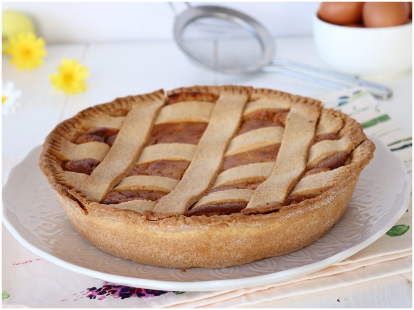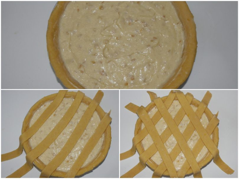 Versate il ripieno all'interno del guscio di frolla fino ad arrivare a mezzo centimetro sotto il bordo, perchè durante la cottura gonfia.Ricavare delle lasagnette sottilissime, aiutandovi con un coltello lungo, porle sul ripieno dando la forma romboidale.