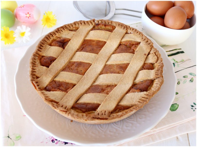 Ritagliate la pasta in eccesso e pigiate con i rebbi di una forchetta tutto intorno. Cuocete la pastiera in forno preriscaldato statico a 180°C per circa un’ora (o fino a che la pastiera non scurisce, se dovesse scurire troppo, coprite con la carta argentata).