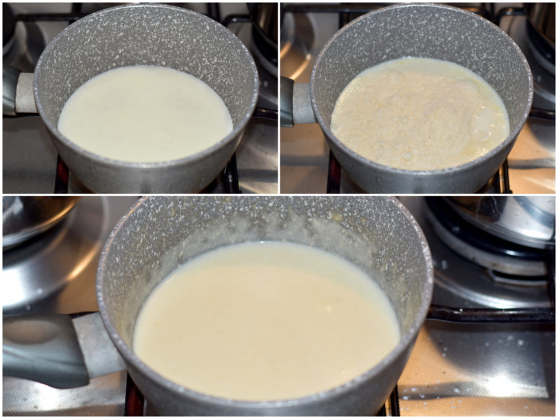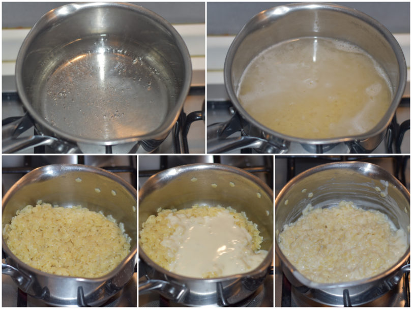 Cuocete la pastina: mettete 2 mestoli di acqua (potete usare anche il brodo, se preferite) in una casseruola, salate e calate la pastina.