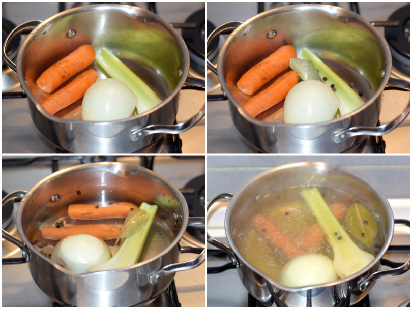 Innanzitutto preparate il brodo: mondate gli ortaggi, metteteli in una pentola con abbondate acqua e aggiungete anche pepe e alloro.