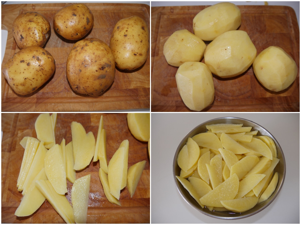 Innanzitutto pelate le patate, lavatele bene, tagliatele a spicchi sottili (vi conviene tagliarle prima a metà e poi a fettine) e lasciatele in acqua fredda per almeno 30 minuti, con un po' di sale.