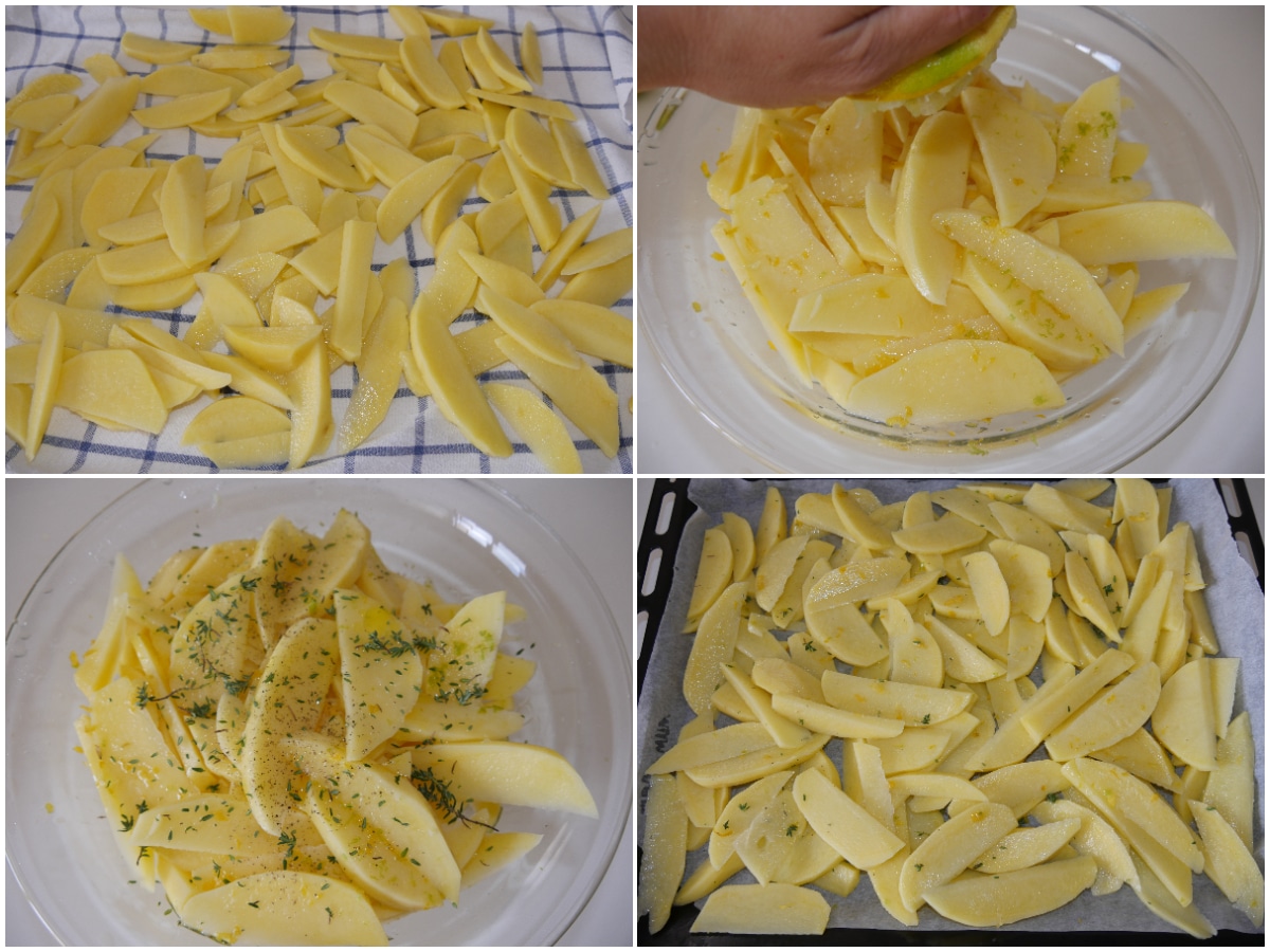 Scolate le patate, asciugatele su di un canovaccio pulito, conditele con limone (buccia e succo), timo, pepe e olio e mescolate, infine distribuitele uniformemente su una teglia rivestita di carta forno, cercando di non farle sovrapporre troppo.