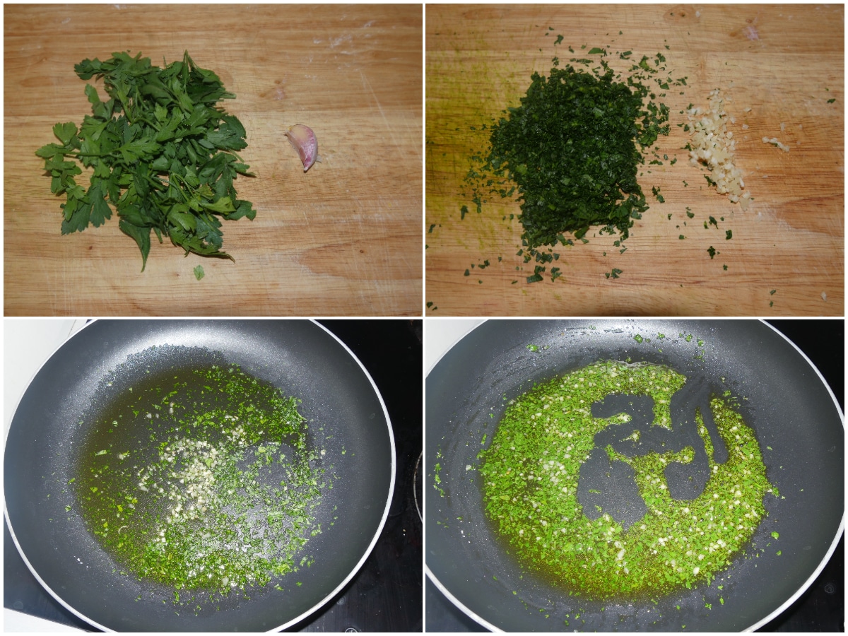 Pulite aglio e 2/3 del prezzemolo, tritateli finemente e fateli insaporire velocemente in padella con dell'olio.
