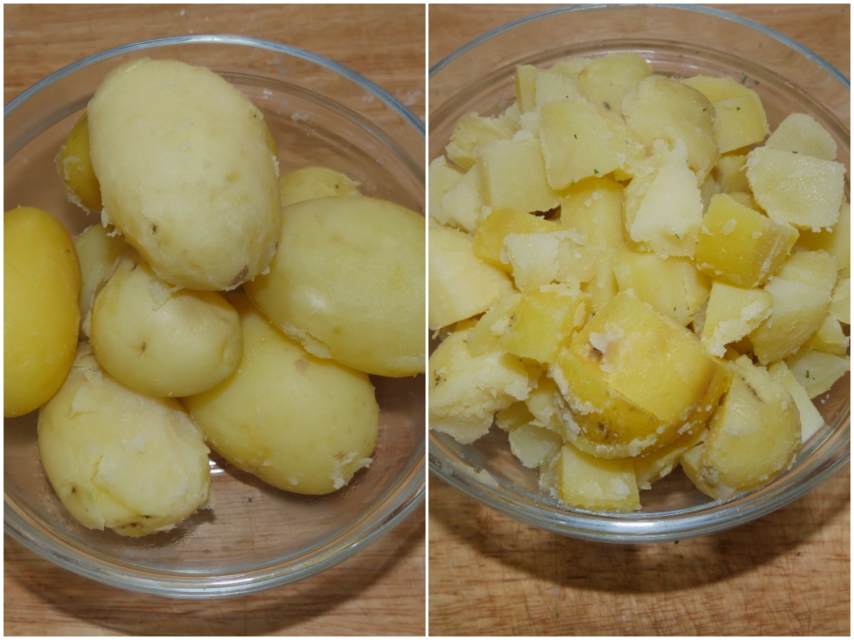 Innanzitutto lavate bene le patate, mettetele in acqua fredda, portate a bollore e fate cuocere per circa 20 minuti (devono essere ancora un po' indietro di cottura, in modo che non perdano la forma).