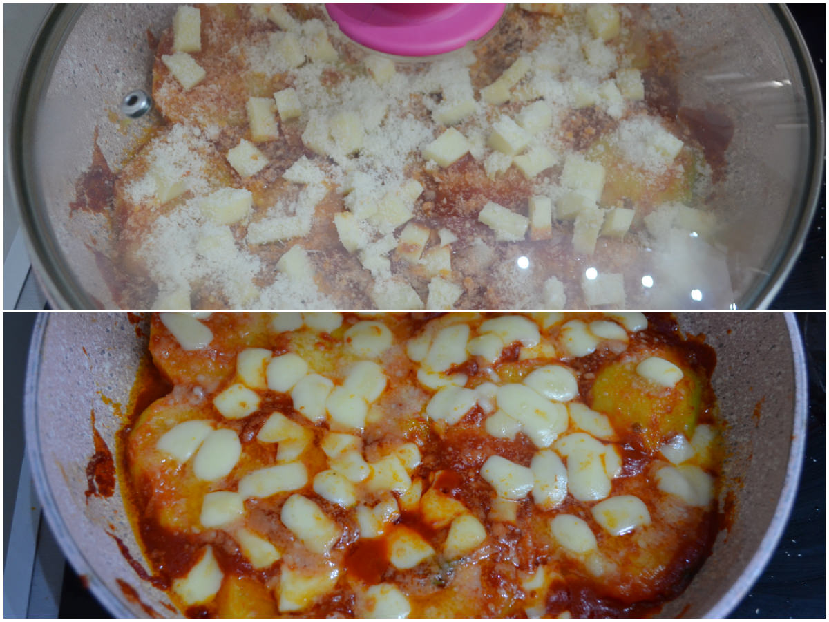 Infine aggiungete provola a dadini e parmigiano garttugiato, rimettete il coperchio e cuocete ancora per qualche minuto, giusto il tempo di far sciogliere i formaggi.